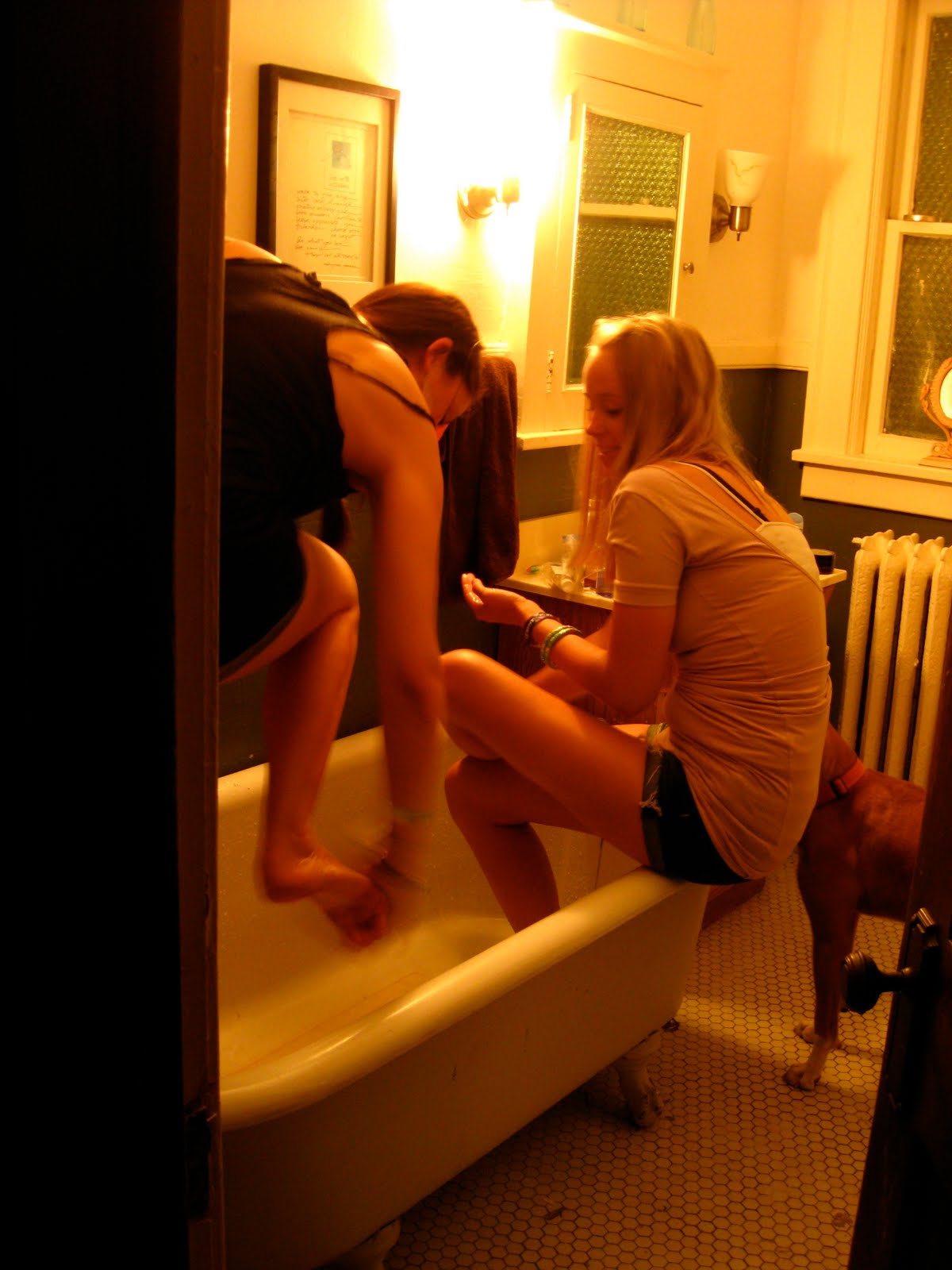 We were all filty, and the girls had to wash their feet… I love this bathroom.