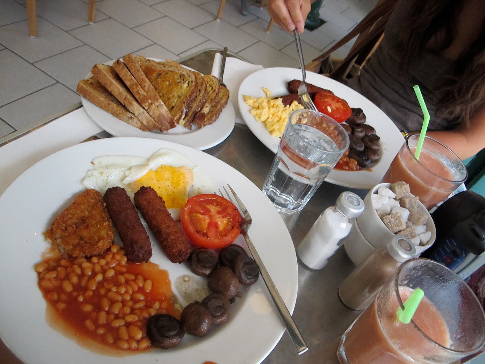 There was this amazing cafe around the corner from our hotel and they had vegetarian sausages! Needless to say, I ate breakfast there ever single day in London and this is what we ordered. yummm.